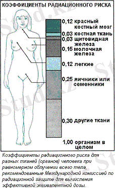 Следует учитывать также, что одни части тела (органы, ткани) более чувствительны, чем другие: например, при одинаковой эквивалентной дозе облучения возникновение рака в легких более вероятно, чем в щитовидной железе, а облучение половых желез особенно опасно из-за риска генетических повреждений.