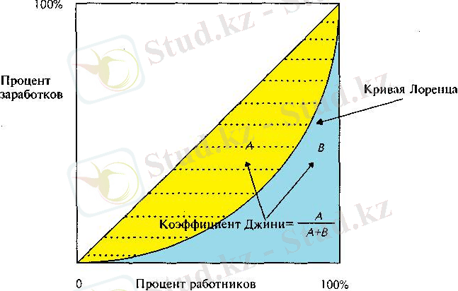 На рисунке 2 он определяется отношением площади заштрихованной фигуры(A), которая образована линиями равномерного и неравномерного распределения доходов, к площади всего треугольника(A+B) в формуле (1) .