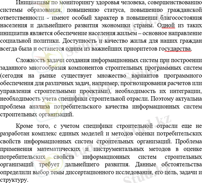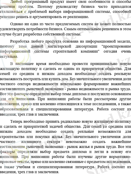 Инициативы по мониторингу здоровья человека, совершенствованию системы образования, повышению статуса, повышению гражданской ответственности - имеют особый характер в повышении благосостояния населения и дальнейшего развития экономики страны. Одной из таких инициатив является обеспечение населения жильем - основное направление социальной политики. Обеспечение граждан качественном доступным жильем - важнейших преимуществ государства. Елбасы Нурсултан Назарбаев А. Наиболее важный задача правительственный политики Назарбаева на 2008 год - увеличение довольство народа Казахстана - упомянуть основные направления обеспечения доступа к жилью, отметив, что жилищная сфера является движущей силой нашей экономики. В первой части диссертации анализируются роль государства в экономике, значение и методы государственного регулирования в целом, зарубежный опыт регулирования жилищных отношений. Во втором разделе проводится анализ нормативно-правовой базы регулирования жилищных отношений в Республике Казахстан и дается комплексный обзор текущей светской стратегий в республике, в том числе текущий уровень жилищной обеспеченности. Государственные перечень жилищного обустройство и их роль, средства и виды жилья по этим программам приведены в третьем разделе итоговой работы. В то же время неблагоприятная ситуация в строительной отрасли, связанная с текущим экономическим кризисом, и пути выхода из него получили широкое распространение. В целом расходы государственного бюджета на развитие человеческого капитала составляют не менее 61% от общих расходов, что свидетельствует о приоритетности Правительства в решении проблем экономики в социальной сфере. Это позволит национальной экономике расти и превосходить ее в будущем. Целью дипломной работы является подробное изучение вопросов жилищного строительства, в том числе совершенствование жилищных механизмов и определение путей выхода из сложившегося кризиса в строительной отрасли.