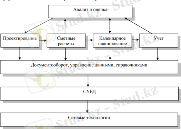Анализ научных и технических публикаций и практики использования информационных систем в деятельности строительных организации позволяет выделить следующие особенности автоматизации строительных организаций: - ориентация на проект. В силу специфики строительства проект оказывается ключевым элементом системы. Методы, технологии и программные средства управления проектами играют значительную роль в информационной системе строительной организации. При этом разные подсистемы рассматривают проект с разных точек зрения и с разной степенью детализации. Высокий уровень риска для организации. Во многих случаях строительная организация берет на себя ответственность за ту или иную сторону строительства крупного объекта. Для многих таких организаций успешное выполнение работ по одному проекту определяют успешность функционирования компании в целом. Проектирование Сметные расчеты Анализ и оценка Документооборот, управление данными, справочниками Календарное планирование СУБД Учет Сетевые технологии взаимное переплетение технической и экономической информации. Например, смета является неотъемлемой частью проектно-сметной строительной документации и сама зависит от параметров проекта ориентация на холдинги. Во многих случаях строительные организации существуют в рамках крупных строительных холдингов. Такой холдинг может включать несколько организаций, осуществляющих проведение строительно-монтажных работ, а также несколько организаций выполняющих задачи, например, перевозка строительных грузов, материально-техническое снабжение, проектирование. Таким образом, информационные системы различных организаций должны интенсивно взаимодействовать между собой. Интеграция разнородных систем. Информационные системы строительных организаций включают множество различных систем: САПР, системы управления проектами, системы сметных расчетов, системы финансового анализа, учетные системы. Все эти компоненты должны взаимодействовать между собой. Высокий уровень ответственности. Результаты функционирования строительных информационных систем воплощаются в конечном итоге в виде выполняемых работ и возводимых зданий. Соответственно гораздо выше по сравнению с другими отраслями и требования к безопасности: к безопасности для жизни и здоровья людей, безопасности для материальных объектов, безопасности с точки зрения охраны окружающей среды. Информационная система должна способствовать соблюдению государственных строительных норм и правил. Значительный объем государственного регулирования. Во-первых, в строительной области от предприятий требуется исполнение многочисленных норм и правил, государственных нормативов и расценок, которые информационная система должна, таким образом, поддерживать. Во-вторых, утверждение государственными органами значительной доли проектных решений. В-третьих, представители государственных органов имеют право и обязанность контролировать соблюдение норм и правил непосредственно во время выполнения строительств и по его окончанию. Это также предъявляет дополнительные требования к информационной системе, которая должна поддерживать государственные утвержденные формы документов, выдавать необходимые отчеты и оперативную информацию. Особый характер взаимоотношений ме