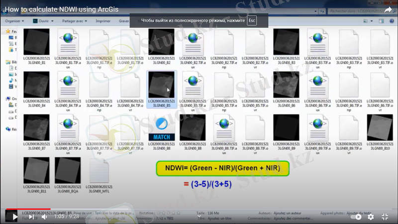 В настоящее время для обнаружения водных объектов по космическим многоспектральным изображениям широко используется Нормализованный разностный водный индекс (NDWI) . Он был введен в 1996 году в Гао, с его помощью можно отразить содержание влаги в растениях и почве, высчитывается с помощью следующей формулы: