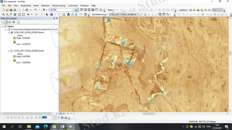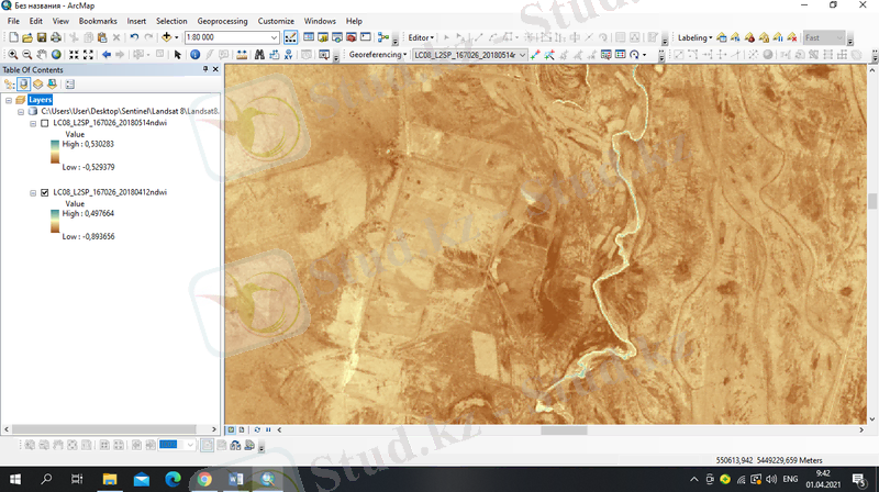 Далее в модуле программы ArcMap были загружены отдельные каналы 3 и 8 снимков серии Sentinel-2.