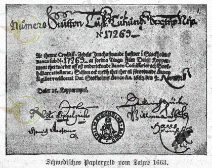Следующим этапом была целевая печать банками банкнот в размере количества монет, доступных конкретному финансовому учреждению. Первым центральным банком в мире был Шведский банк, основанный в 1668 году. В России печать банкнот началась через сто лет, во время правления Екатерины II.
