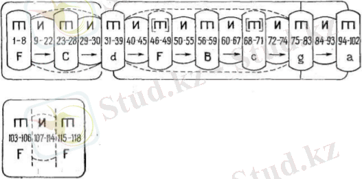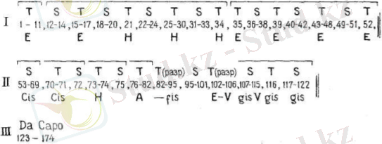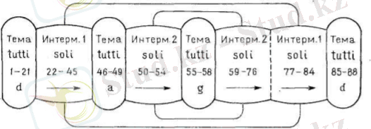 Третий тип формы - содержит повторение в конце формы целой группы ритурнелей и эпизодов из начала формы. Первая часть скрипичного концерта E-dur однотемна, и контрасты между проведениями темы и интермедиями здесь можно считать совпадающими с сопоставлениями tutti и соло (на схеме обозначены буквами Т и S, см. Схему 3) ;