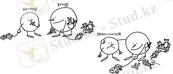 Кому-то из вас поможет рис. 3-11, который рассказывает о реакции между натрием и хлором так, как будто это случилось в "химическом детском саду". В этом “детском саду” порядки такие же, как и в обычном. У Хлора целых 7 игрушек (электронов) . Натрию же достался только грузовичок (1 электрон) . Тут Хлор увидел у Натрия грузовичок и решил, что именно этой игрушки ему и не хватает! Хлор посильнее, поэтому грузовичок мгновенно оказался у него. А чтобы Натрий не ябедничал (у него такой окислившийся вид!), Хлор предложил поиграть вместе. Какое там! Конечно же, все 8 игрушек Хлор подтащил поближе к себе, а Натрию только и остается, что стоять рядом с “окисленным” видом.