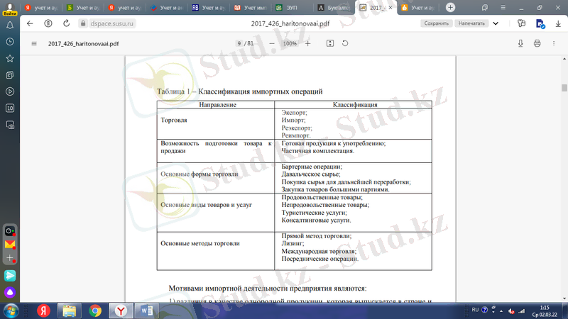 4) Стоимость товара, который был предоставлен контрагенту в лизинг или аренду. Классификация импортных операций осуществляется по следующим направлениям (Таблица 1) :