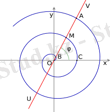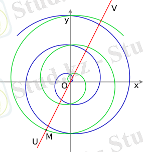 Обе ветви спирали представляются схожим уравнением (1) . Положительным значениям согласовывается правая спираль, отрицательным - левая спираль. Если точка M будет двигаться по прямой UV из отрицательных значений через центр вращения O и далее в положительные значения, вдоль прямой UV, то точка M опишет обе ветви спирали.