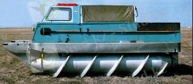 Другой способ использования - применение архимедовых винтов вместо колес. Принцип движения шнекороторного вездехода прост. Машина оборудована двумя или более соосными с направлением движения рвинтами Архимеда. При вращении они отталкиваются от кашеобразной или жидкой субстанции, по которой движется вездеход, и продвигают его вперед