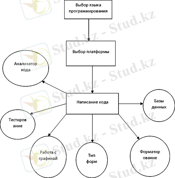Следует рассмотреть функциональные составляющие данного программного средства. На рисунке 1. 1 представлен функционал программы. В начале пользователь начинает с выбора языка программирования, следом выбирает платформу, на которой будет писаться данная программа. Потом начинается написание самой кода, параллельно он может вызвать анализатор кода, проводить тестирование, работать с графикой, выбирать тип форм, выбирать форматирование и работать с базой данных. Таким образом пользователь получит разнообразный функционал, который в будущем может использовать для написание более качественного программного продукта.