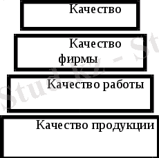 На вершине пирамиды находится TQM - всеобъемлющее, тотальное управление качеством, предполагающее высокое качество всех работ для достижения требуемого качества продукции. В первую очередь это работа, связанная с обеспечением высокого организационно-технического уровня производства, надлежащих условий труда. Качество работы включает в себя обоснованность управленческих решений, систему планирования. Особое значение имеет качество работ, непосредственно связанных с производством продукции (контроль качества технологических процессов, своевременное выявление брака) . Качество продукции является составной частью и следствием качества работы. Здесь непосредственно оценивается качество подходящей продукции, мнение потребителя, анализируются жалобы.