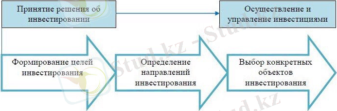 - специальный квалифицированный аттестат или сертификат. На сегодняшний день большинство физических лиц - потенциальных инвесторов являются неквалифицированными. Они не обладают специальными навыками и знаниями, необходимыми для оценки всевозможных рисков, и не всегда способны принять правильные решения на основе собственных оценок. Источником осуществления инвестиционной деятельности физических лиц являются свободные денежных средства, т. е. сбережения. При этом, в отечественной литературе сбережения трактуются, как «часть личного дохода, которая остается неиспользованной при затратах на текущие потребительские нужды и накапливается», а ряд современных западных экономистов считает, что это «та часть дохода семейного хозяйства, которая не идет на покупку товаров и услуг, а также на уплату налогов» [22, с. 27] . Таким образом, выделяются личные сбережения и сбережения домашнего хозяйства. Данные различия не имеют существенного значения, поскольку физические лица в инвестиционном процессе могут выступать как в качестве единоличного участника, так и в форме объединения в домашнее хозяйство. При осуществлении инвестиционной деятельности физические лица включаются в инвестиционный процесс, который представляет собой совокупность последовательных этапов, которые схематично можно отобразить следующим образом (рисунок 1) :