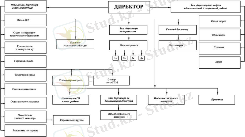 Во главе автобусного парка стоит директор. Он распоряжается всеми средствами предприятия, контролирует и направляет деятельность всех подразделений. Ему подчинены функциональные отделы. Он несёт ответственность за материально-техническое обеспечение всего производства, состояние охраны труда и техники безопасности. Руководит деятельностью подразделений эксплуатационной службы предприятия. Осуществляет руководство разработкой текущих и перспективных планов перевозок, изучением обслуживаемого региона, направление пассажиропотоков. Принимает меры по своевременному заключению договоров с организациями и контролирует их выполнение. Организует работу по развитию и расширению платных услуг населению (рисунок 2. 1) .