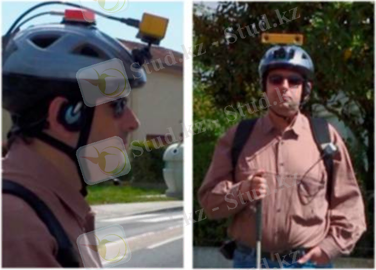 В данной разработке было создано ассистивное устройство с целью улучшения картографирования местоположения пользователя и позиционирования окружающих объектов с использованием двух функций: на основе метода сопоставления карт и искусственного зрения. Первая функция помогает в обнаружении нужного объекта, а также позволяет пользователю давать инструкции, перемещая ее/его голову к цели. Вторая помогает в автоматическом обнаружении визуальных целей. Как показано на рис. 3, этот прибор состоит из 2 камер, установленных на шлеме, для видео-входного сигнала, приемник GPS, наушники, микрофон, и прибор Xsens Mti, который отслеживает и воспринимает движение вокруг. Система обрабатывает видеопоток с размером изображения 320 × 240 пикселей, с помощью алгоритма распознавания SpikNet для поиска визуальных объектов.