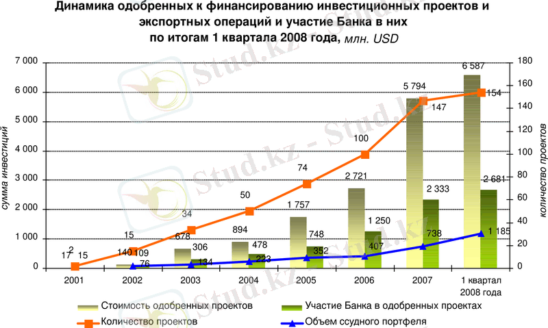 В 1-ом квартале были одобрены 3 инвестиционных проекта на сумму 729, 3 млн. долларов США с участием Банка - 240, 8 млн. долларов США.