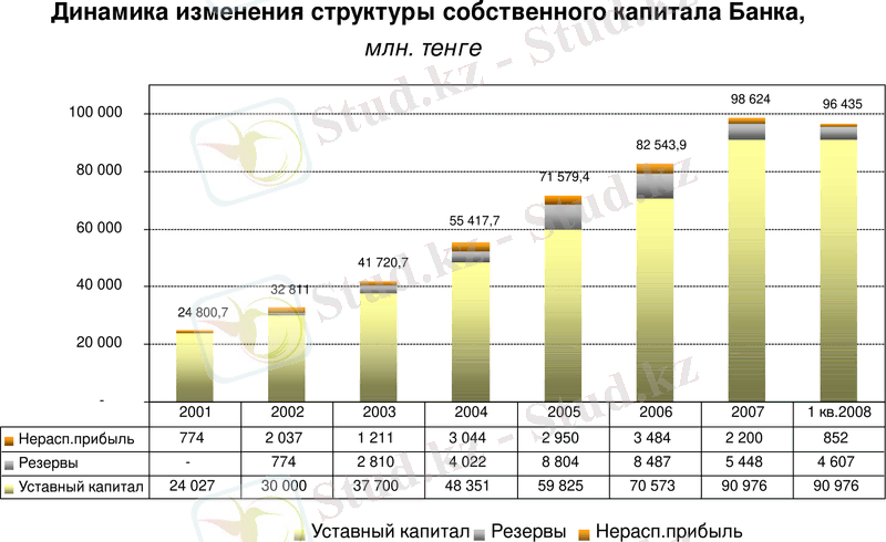 Собственный капитал Банка по итогам 1 квартала 2008 года составил 96, 4 млрд. тенге, снизившись с начала года на 2, 2 млрд. тенге или на 2%. Это было вызвано снижением доли резервного капитала за счет увеличения резервов от прочей переоценки.