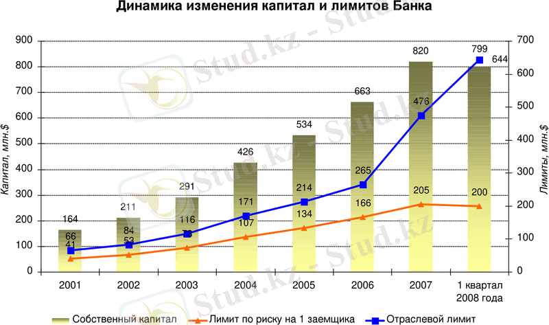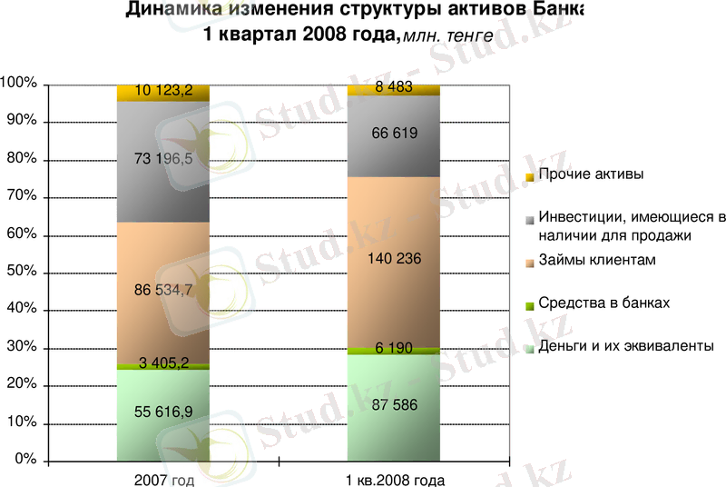 С начала текущего 2008 года объем активов Банка увеличился на 35%, достигнув на 1 апреля 2008 года 309, 6 млрд. тенге.