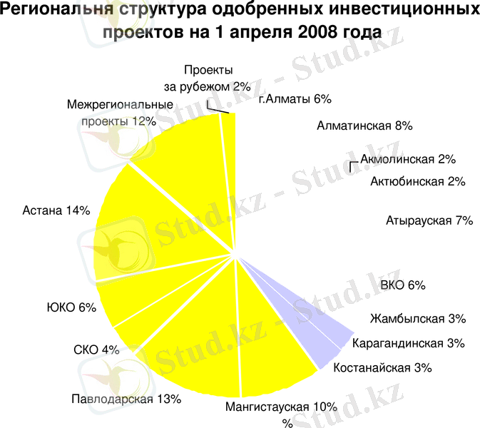 В целях комплексного развития территорий Казахстана и их вовлечения в реализацию Стратегии индустриально-инновационного развития Банком осуществляется кредитование практически во всех регионах Казахстана. Наибольший удельный вес в региональной структуре принадлежит г. Астане (14%), Павлодарской области (13%), межрегиональным проектам (12%) (рис. 3) .