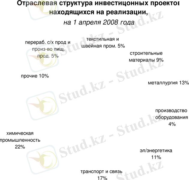 Отраслевая структура инвестиционных проектов, одобренных Банком к финансированию, представлена на рисунке №4. Наибольший удельный вес занимают проекты в химической отрасли (22%) . На проекты в области транспорта и связи приходится 17%, в металлургической отрасли - 13%, в электроэнергетике - 11%, производство строительных материалов - 9%.