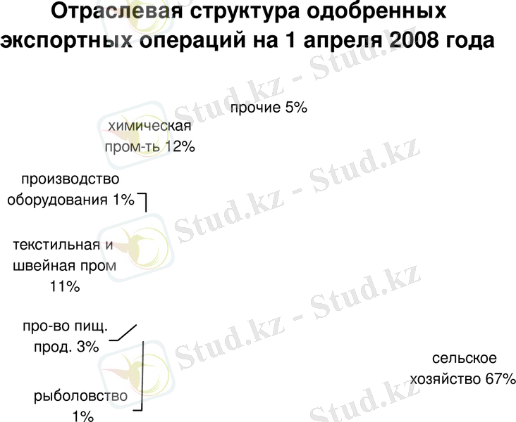 В отраслевой структуре участия Банка в одобренных к финансированию экспортных операциях на 1 апреля 2008 года преобладает доля операций по экспорту продукции сельского хозяйства (67%), химической промышленности (12%) и текстильной и швейной промышленности (11%) .
