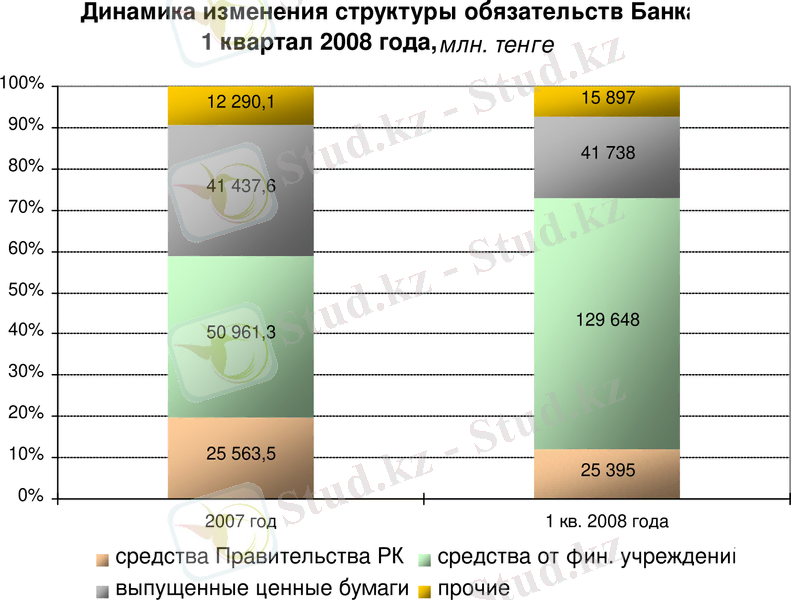 Изменение структуры обязательств Банка на конец первого квартала 2008 года в большей степени связано с привлечением Банком заемных средств, увеличением обязательств, отраженных в категории «Прочие обязательства».