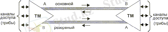 Соединение узлов А и В с помощью терминальных мультиплексоров ТМ является наиболее простым примером организации сети SDH. Основной и резервный (электрические или оптические) агрегатные выходы формируют систему резервирования типа 1+1. При отказе основного канала сеть автоматически переходит на резервный канал.
