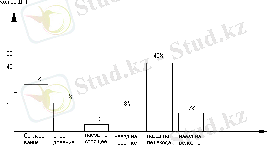 Из вышеприведенной таблицы видно, что преобладающими видами ДТП является столкновение транспортных средств (26%), наезд на пешехода (45%) и наезд на стоящее транспортное средство (3%) . Это можно объяснить многими факторами. Во первых, самой главной причиной столкновений транспортных средств являются сами водители, которые часто пренебрегают правилами дорожного движения. В число ДТП этих нарушений входят: обгон транспортного средства перед перекрестком, несоблюдение очередности проезда перекрестков, движение при красном свете светофора и так далее кроме того, основной причиной ДТП является состояние водителя, то есть вождение водителей автомобиля в нетрезвом состоянии.