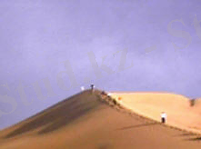 бархан, Поющая гора. Сложена она из песка светлых тонов и на фоне темных отрогов Джунгарского Алатау - Большого и Малого Калканов - представляет необычайное зрелище благодаря цветовому контрасту.