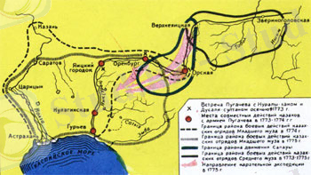 Так, у стен Оренбурга и в прилегающих районах действовало несколько тысяч казахов. Они принимали участие не только в осаде крепости, но и снабжали армию Пугачева провиантом и фуражом, контролировали дороги, сражались с царскими войсками на подступах к городу, на Самарской дистанции и у Татищевой крепости.