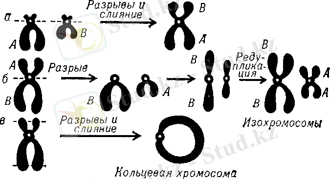 3. Изохромосомы - плечи одной хромосомы разрываются в центромерном районе; при делении клетки образуются хромосомы с равными плечами (метоцентрик), при этом количество генов удваивается (Рисунок 1(б) ) .