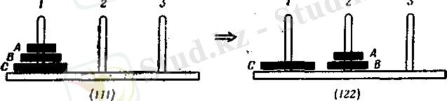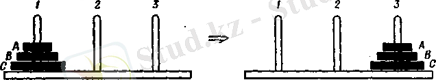 а меньший диск А - вверху. Требуется переместить все диски на третий колышек, двигая их по очереди. Перемещать можно всегда только верхний диск, причем нельзя никакой диск помещать выше меньшего. Начальное и целевое расположения, показаны на рисунке 1.