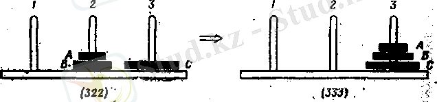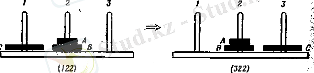 1. Для того чтобы переложить все диски на колышек 3, мы, конечно, должны переложить на этот колышек диск С, причем в момент, непосредственно предшествующий перекладыванию диска С на колышек 3, последний должен быть свободным.