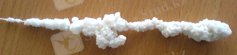 В результате этого опыта кристалл начал расти на нити, находящейся с внешней стороны. У меня получилась красивая кристаллическая нить из мелких кристалликов, похожая на украшение.