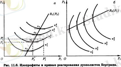 Таким образом, при любом изменении цены дуополиста 2 существует единственная цена дуополиста 1, максимизирующая его прибыль. Эта цена определяется самой низкой точкой наиболее высоко лежащей изопрофиты дуополиста 1. Такие точки ( e 1 ≈ q 4 на рисунке, а) по мере перехода к более высоким изопрофитам смещаются вправо. Это значит, что, увеличивая свою прибыль, дуополист 1 делает это за счет привлечения покупателей дуополиста 2, повышающего свою цену, даже если при этом дуополист 1 тоже увеличивает цену. Соединив наиболее низко лежащие точки всех последовательно расположенных изопрофит, мы получим кривую реагирования дуополиста 1 на изменения цен дуополистом 2 ≈ R 1 ( P 2 ) на рисунке, а. Абсциссы точек этой кривой представляют собой цены дуополиста 1 при заданных ординатами этих точек ценах дуополиста 2. Соответственно линия R 2 ( P 1 ) на рисунке, б представляет кривую реагирования дуополиста 2 на множестве его изопрофит ( 1 2 , 2 2 , 3 2 , 4 2 ) .