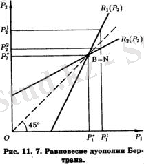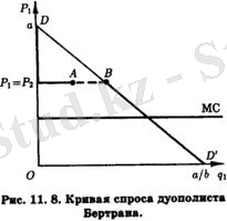 Кроме того, в состоянии равновесия Бертрана≈Нэша равновесная цена окажется равной предельным затратам каждого из дуополистов. В противном случае дуополисты, руководствуясь каждый стремлением овладеть всем рынком, будут снижать свои цены, а это их стремление может быть парализовано, лишь когда они уравняют свои цены не только между собой, но и с предельными затратами. Естественно, что в этом случае общая отраслевая прибыль окажется нулевой. Таким образом, несмотря на исключительную немногочисленность продавцов (в дуополии их лишь двое), модель Бертрана предсказывает, по сути дела, совершенно конкурентное равновесие отрасли, имеющей строение дуополии.