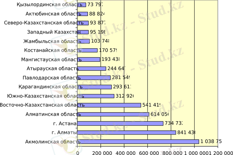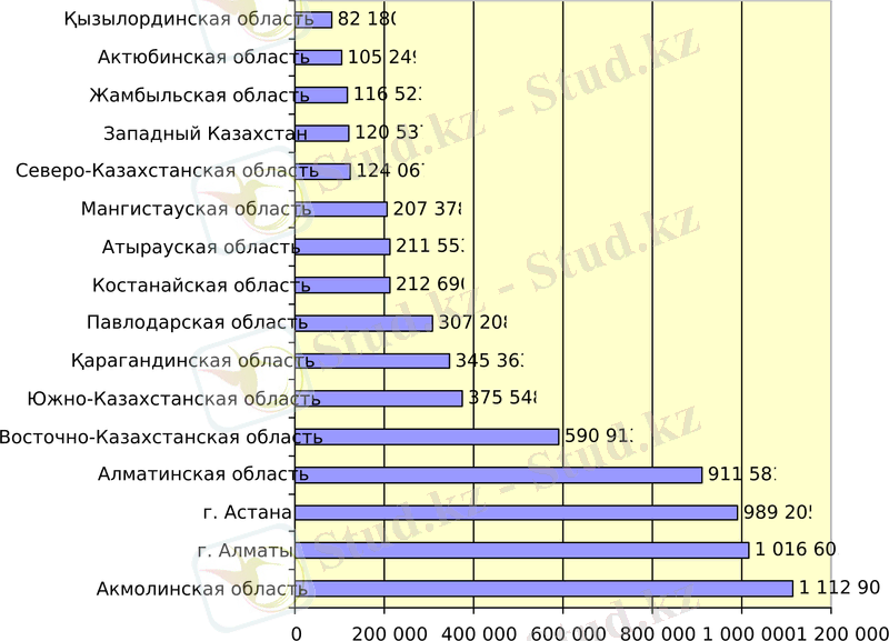 Из таблицы 1 и рисунка 1 видно, что распределение потока туристов по областям и курортам Казахстана крайне неравномерно. По количеству обслуженных туристов лидирует Акмолинская область 1 112 901 человек., на втором месте г. Алматы 1016603 человек и на третьем месте г. Астана 989 205 человек.