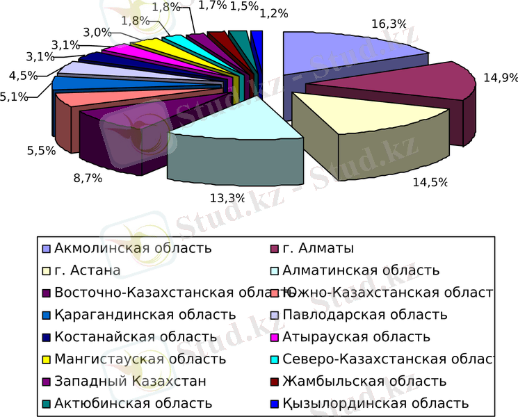 Из рисунка 5 видно, что наибольшую долю на рынке по количеству обслуженных туристов занимает Акмолинская область (16, 3%), г. Алматы (14, 9 %), г. Астана (14, 5%), Алматинская область(13, 3%) . На данные объекты приходится 59 % туристского рынка Республики Казахстан.