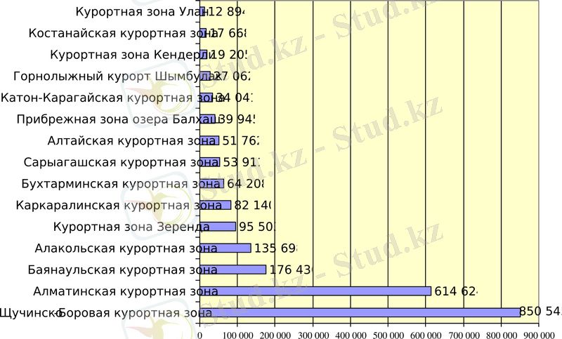 Из рисунка 8 видно, что среди курортных зон Казахстана лидирующими по количеству обслуженных туристов в 2017 году являются Щучинско-Боровская курортная зона (850 545), Алматинская курортная зона (614 624) . Данные курортные зоны идут со значительным отрывом от других курортных зон, так Баянаульская курортная зона, идущая на третьем месте, имеет только 176 430 посетителей.