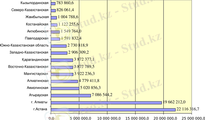 Из рисунка 4 видно, что наибольший объем услуг, оказанный местами размещения в 2016 году наблюдался в г. Астана 22, 1 млрд. тг., в г. Алматы 19, 6 млрд. тг. Эти два города иду с большим отрывом от других городов. Так на третьем месте идет Атырауская облать 7 млрд. тг. Города Астана и Алматы занимают по доходам 50 % рынка гостиничных услуг Казахстана.