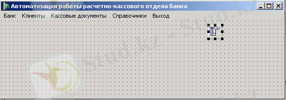 Для того, чтобы управлять документами Расчетно-Кассового Отдела, создадим новое приложение с помощью команды меню File-New-Application . После выполнения этих команд откроется новая форма. С помощью Инспектора Объектов изменим свойство Name данной формы на fmMain, а в свойство Caption впишем «Автоматизация работы расчетно-кассового отдела банка»- эта надпись появится в заголовке формы. Для того чтобы создать меню, установим компонент MainMenu . C его помощью создаем меню как показано на рисунке: