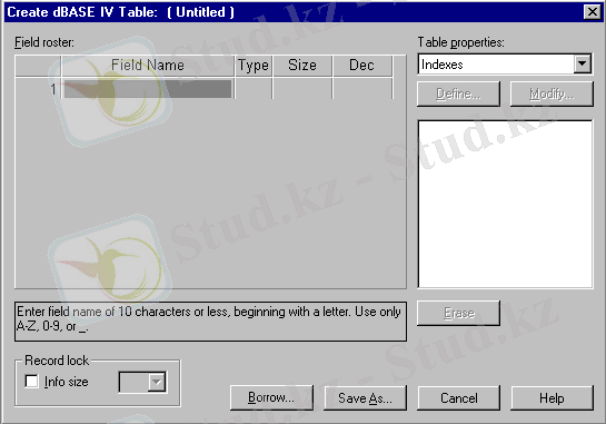 В этом окне надо ввести названия полей, указать их типы, длину полей, и если необходимо определить индексные файлы и прочее. Названия полей будем вводить в столбце Field name, типы полей - в столбце Type, длину полей укажем в столбце Size, а если поле числовое, то количество знаков после десятичной точки указываем в столбце Dec.
