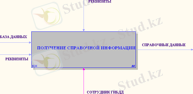 БАЗА ДАННЫХ и РЕКВИЗИТЫ, например, новая или отредактированная запись, являются входами работы (Input), т. е. тем материалом или информацией, которая используется или может преобразовываться работой. Так, оператор, чтобы получить необходимую ему информацию, задает определенные РЕКВИЗИТЫ, которые используются в ходе выполнения работы. В работе также используется информация из БАЗЫ ДАННЫХ, при этом возможно и ее (информации) изменение.