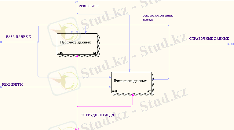 На рис. 2 представлена диаграмма декомпозиции первого уровня, содержащая две работы ПРОСМОТР ДАННЫХ и ИЗМЕНЕНИЕ ДАННЫХ.