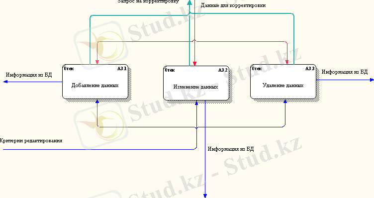 В работе ИЗМЕНЕНИЕ ДАННЫХ управлением являются только РЕКВИЗИТЫ, параметры изменения данных или же новая запись, добавляемая в БД, которые сами при выполнении работы не изменяются. Входом служат РЕКВИЗИТЫ, например, редактируемая информация, т. е. данные, которые пользователь редактирует или удаляет. Отредактированные данные пользователь вправе увидеть на экране, что показано на диаграмме выходной стрелкой ОТРЕДАКТИРОВАННЫЕ ДАННЫЕ, поступающей в качестве управления на работу, описанную выше.