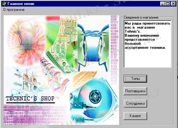 Вся программная часть курсовой работы направлена на реализацию получения данных из базы. Основной частью приложения являются формы проекта и расположенные на ней компоненты. Главная форма проекта состоит из четырех основных кнопок которые выводят таблицы: ”Типы”, ”Поставщики”, “Сотрудники”, “Клиент”.