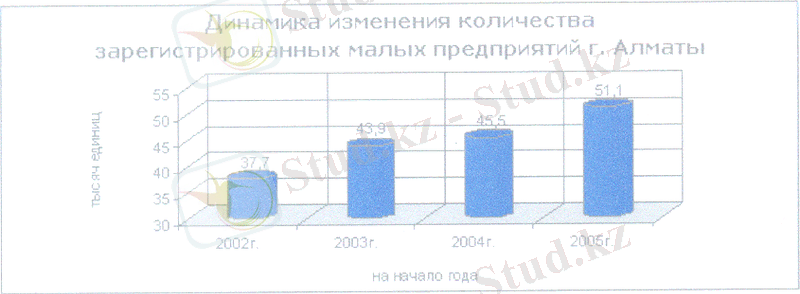На начало 2005 года в г. Алматы зарегистрировано 51, 1 тыс. малых предприятий, что в общественной структуре республики составило 33, 2%. Динамика изменения количества малых предприятий города положительна, что наглядно отображает следующий график: