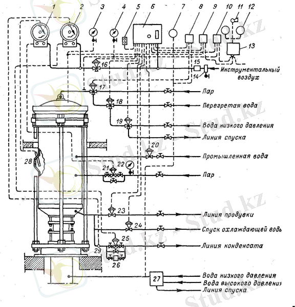 Регулирующие клапаны 81 и 84 позволяют следить за уровнем в теплообменнике Т-13 и емкости Е-20/1. Уровень измеряется и регулируется при помощи датчиков уровня, а также регулятора и клапана, который при превышении заданного уровня увеличивает выход (спуск) поступающей жидкости.