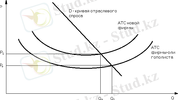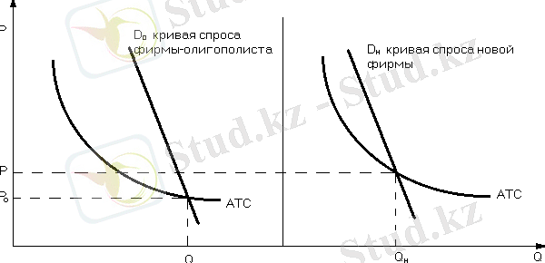 Фирмы-олигополисты, зная, что появление нового конкурента уменьшит их долю рынка, попробуют не допустить этого, воспользовавшись своими преимуществами. Они установят цену ниже Р н , но в силу экономии от масштабов производства и в этом случае (между Р н и Р о ) будут получать прибыль. Новая же фирма понесет значительные потери и вынуждена будет уйти с рынка (при ценах ниже Р н кривая спроса D н лежит ниже АТС, и, следовательно, новая фирма не может покрыть своих издержек) .