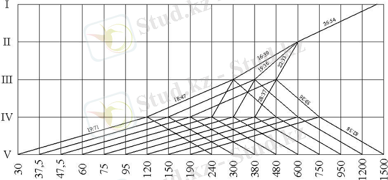 3. Передаточные отношения изображаются в виде линий, соединяющих точки соответствующих чисел оборотов соседних валов.