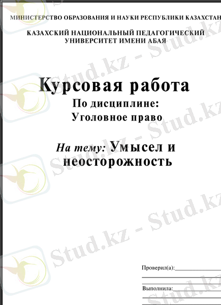 В качестве темы для своей курсовой работы я выбрала формы вины, т. е. умысел и неосторожность. Эта тема меня интересует лично, в первую очередь, как человека и будущего юриста, и не в последнюю очередь как гражданина Республики Казахстан.