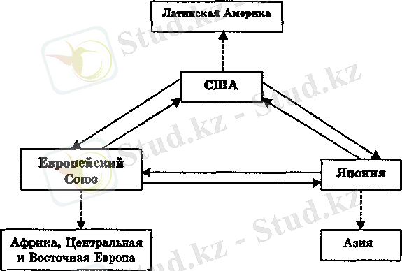Страны этой группы - США, Европейский Союз и Япония, образуют три наиболее развитых центра ми-ровой экономики (триаду), в значительной мере опре-деляющего архитектуру современного мирового хозяй-ства. С одной стороны, бесспорным приоритетом их внешнеэкономических связей являются связи друг с другом, с другой - каждый из центров триады имеет регионы своего предпочтительного влияния в мировой экономической системе (табл. 3) .